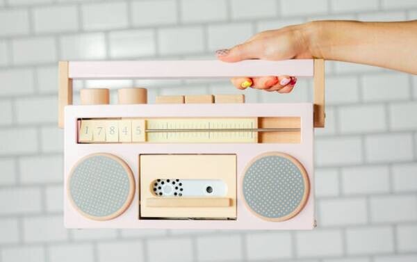 木製なのにカセットテープに電池が内蔵されており、本当に録音できてしまうラジカセ型のおもちゃ。