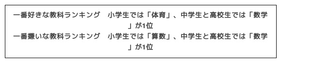 他方、一番嫌いな教科をきいたところ、小学生では1位「算数」(25.1%)、2位「国語」(18.5%)、3位「体育」(7.2%)、中学生では1位「数学」(25.3%)、2位「英語」(15.7%)、3位「国語」(12.8%)、高校生では1位「数学」(28.2%)、2位「外国語」(18.8%)、3位「国語」(9.5%)となりました。
