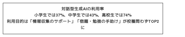 ★対話型生成AIの使用率は43%、使用目的TOP3 「情報収集のサポート」「宿題・勉強の手助け」「文章・物語の作成」