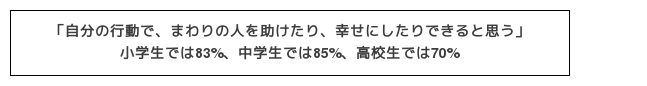 自分の行動で、まわりの人を助けたり、幸せにしたりできると思うかをきいたところ、「思う」と回答した人の割合は、小学生では83.3%、中学生では84.8%、高校生では70.0%となりました。