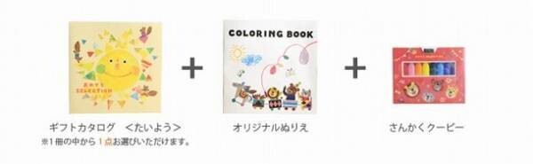 5種類のカタログは、それぞれ「オリジナルぬりえ」と「さんかくクーピー」がセットに。お好きなアイテムをカタログで選べるだけでなく、ゆくゆくはお子様が楽しめるぬり絵もついて、親子で楽しめるギフトカタログセットです。