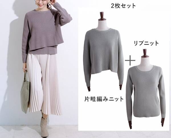 リブ編みニットと片畦編みの2種類の長袖ニットのセット。重ねて着れば、旬のレイヤードスタイルに。