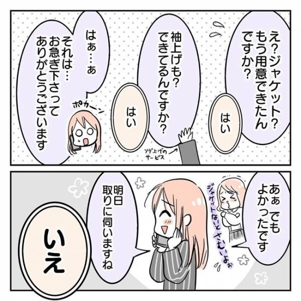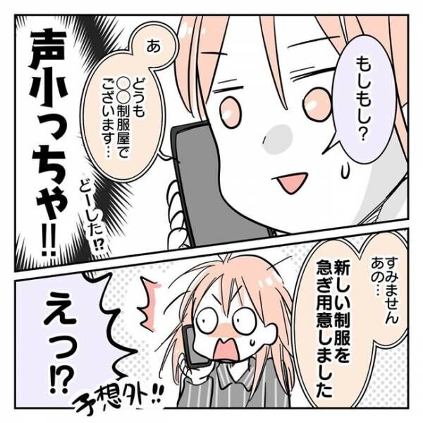電話での態度が先ほどと一変し、「袖上げをした新しい制服を用意しました」と連絡をくれました。その上、「こちらがお届けに上がります」と、先ほどと言っていることが180度変わり、サヤさんは思わず「ホント、どーした?」と困惑するのでした。