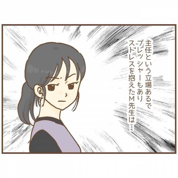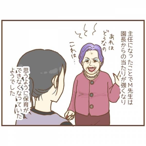 M先生は主任になってから園長からの当たりが強くなり、プレッシャーやストレスを抱え込み悶々としており、さくらさんのことを睨みつけるのでした。