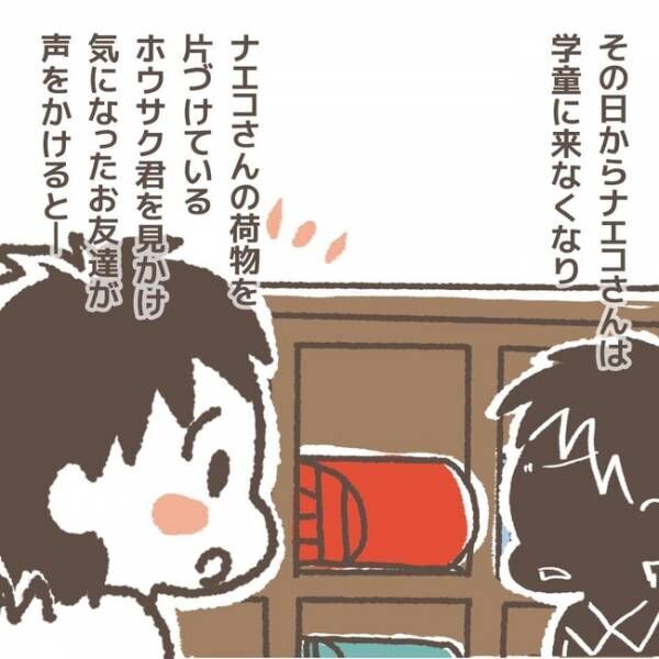この一件で大人しくなったホウサクくん。しかし、妹のナエコちゃんの態度は変わらず、自分より弱そうな相手を選びその子の持ち物をわざと持ち出すということを繰り返していたのです。この行動を見過ごすわけにはいかないと、学童の指導員である実田先生がナエコちゃんの親へ連絡をします。学童経営者である畑山さんの配布した手紙