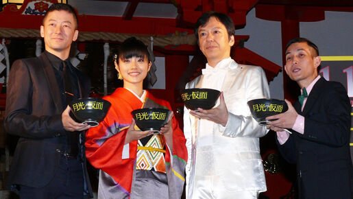 さらにその後、登壇陣は“月光ノ仮面”にちなんで月見そばを食べて改めてヒットを祈願。板尾監督は「そばのように細く長く上映できれば」と映画の成功を祈っていた。