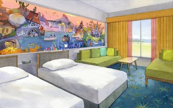 客室には、東京ディズニーランドの「ジャングルクルーズ:ワイルドライフ・エクスペディション」や東京ディズニーシーの「海底2万マイル」などのアトラクションをイメージしたアートが壁一面に描かれ、当該アートを眺めながら翌日のパークで出会える“冒険”や“発見”へのわくわくした気持ちが高まる滞在を約束。同ホテルならではの魅力満載だ。