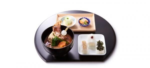 「8種のおだしと真鯛のお椀」は、かつお、昆布、しいたけなどでとった和風だし、フォン・ド・ボー、フュメ・ド・コキーユなどフランス料理に使われるだしに加え、鶏白湯などの中華だしを贅沢に8種類掛け合わせたお椀に、柔らかく炊いた大ぶりな大根と、愛媛県産真鯛の煮つけを添えた一品。