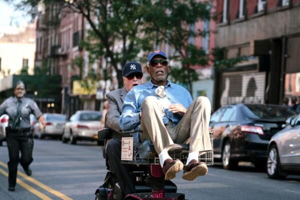 しかし、逃走のため、車で待たせていたはずのアル(アラン・アーキン)がいつの間にかいなくなり、警備員に追い詰められたジョーはとっさに老婆から電動車いすを奪い、車道へ!“盗んだバイク(!?)で走り出した”ジョー役のケインは、このシーンについて「あれは古典的でちょっとスローなカーチェイスさ」と笑う。電動車いすの前カゴにすっぽりとはまり、“ET”さながらのフリーマンはすっかりその場所がお気に入りになってしまったよう。「モーガンはほぼ1日中、あのカゴの中で過ごしていました」 と明かすのはザック・ブラフ監督だ。