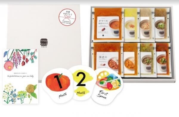 また同封のベビーマンスリーカード(月齢カード)は、スープに使われる食材をモチーフにした12か月のカードで、毎月の生まれた日などの記念撮影時に使うことができ、子どもの成長を記録しお祝いする楽しみが生まれる。また初めてスプーンを使う日用のファーストスプーンカードもセットになっている。出産を控えている家族向けに、出産お祝いの検討リストにぜひ加えてみてはいかが?