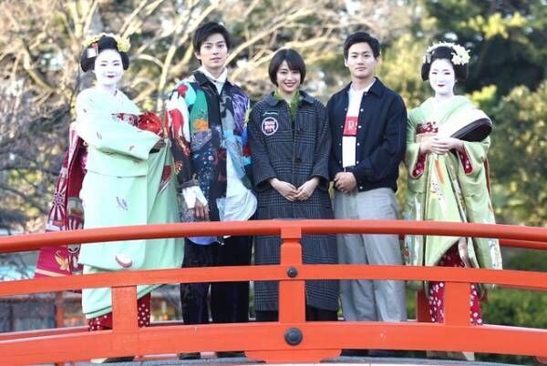 2か所目の京都では、“お花見発祥の地”としても知られる、神泉苑(京都市中京区)に参拝。お出迎えした舞妓さん2人と記念撮影を行い、3人で“願いが叶う”といわれている「法成橋」を渡り、映画のさらなる大ヒットを祈願した。