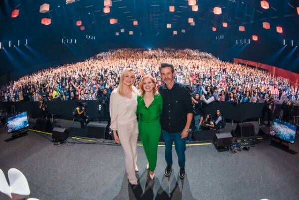 現地時間12月7日、物語の鍵を握るジーン・グレイ役のソフィー、謎の女性を演じるジェシカ、キンバーグ監督がブラジルコミコンに降臨。熱い熱気に包まれた満席の会場に、白のスーツに身を包んだソフィーと、グリーンのスーツをクールに着こなしたジェシカは大満足の様子。ファンとの交流を満喫し、ステージで横たわって記念撮影するひと幕も見られた。