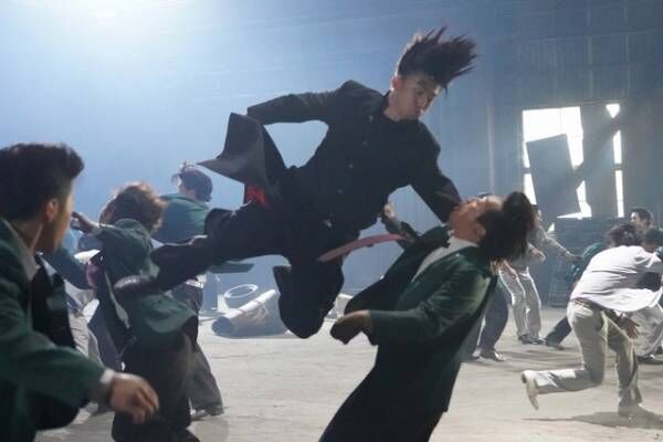倒れこむ北根壊と開久の生徒の前に、強いまなざしで現れる三橋(賀来賢人)や、北根壊に飛び蹴りするトゲトゲ頭の伊藤(伊藤健太郎)をはじめ、得意の合気道で紅一点戦う理子(清野菜名)や、にやりと笑みを浮かべ蹴りを入れる番長・柳(柳楽優弥)。