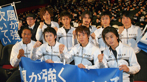 これまでのプロモーションの場では一貫して陸上部のジャージ姿で登場してきた一同だが、その姿もこの日で見納め。この日は客席後方の扉から一斉に走りながら登場した。観客の盛大な拍手と歓声に、リーダー・ハイジ役の小出さんは「胸がすごくドキドキしています」と興奮を口にした。続いて、カケル役の林さんは、「10人で走りに走りぬいた作品です。えー“風強爽男(かぜつよそうめん)”です!この“風強爽男”が全国に伝わればいいなと思います」と元気良く挨拶した。