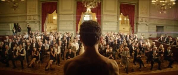 今回解禁された写真には、厳かな空間の中で“アート作品”として大勢の人物に品評される男の姿が写し出されている。