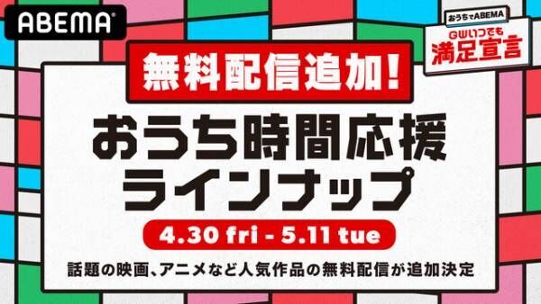 昨今の状況下、おうちで過ごす時間が長くなっている中、「ABEMA」を通じて少しでも楽しい時間を過ごしてほしいという思いのもと、“おうち時間応援”として、映画全50作品の無料配信が追加決定、また期間中人気アニメ全15作品も無料配信。