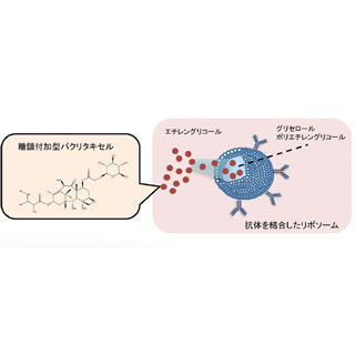 同研究グループは「水溶性を高めたパクリタキセル誘導体を効率よくリポソームに封入し、がん細胞を特異的に認識する抗体を結合させるこの技術は、がん治療薬の副作用を抑制しつつ、がん細胞への集積効果を高めることのできる新たなDDSだ」とコメント。また、リポソームは肝臓を介して腸管へ排出されるが、パクリタキセルは腸管から吸収されないため、過剰投与しても副作用を起こすことが考えにくい安全な製剤が可能になるという。