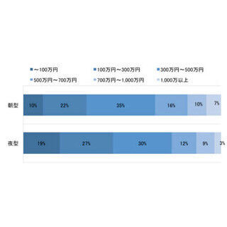 一方、男性の場合は朝型・夜型とも年収にばらつきはあったものの、「~100万円」「100万円~300万円」では夜型のほうが高い割合となったのに対し、300万円以上では朝型のほうが平均5%高くなっていた。