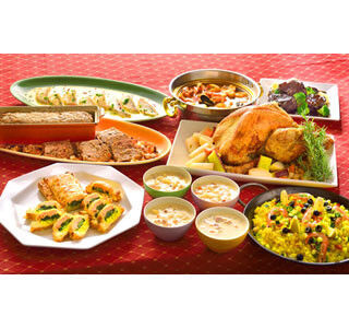 同ブッフェでは、ローストチキンやミートローフなどのクリスマスメニューをはじめ、チーズフォンデュ、ブイヤベース、パエリア、伝統的なフランス料理のソース"ブールブランソース"をかけた高級魚のイトヨリなど、さまざまな料理を日替わりで提供する。