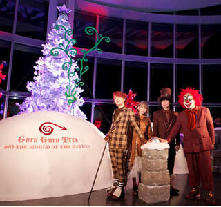 「Guru Guru Tree by THE WORLD OF TIM BURTONT」は高さ約5mのクリスマスツリー。映画監督のティム・バートン氏による作品「無題(雪の中のトナカイ)」と「絶滅寸前」がモチーフとなっており、同氏の多数の作品に登場する「グルグル」を想起させる装飾が施されている。