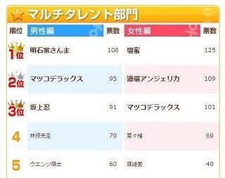 マルチタレント部門男性編は、1位明石家さんま(108票)、2位マツコ・デラックス(95票)、3位坂上忍(91票)、4位林修先生(79票)、5位ウエンツ瑛士(60票)、6位タモリ(43票)、7位所ジョージ(33票)、8位杉村太蔵(21票)、9位K.Will(15票)、10位哀川翔(8票)という結果になった。