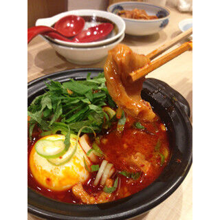 程よく辛いスープだが、玉子を割ると黄身がとろ~りの半熟玉子で、辛みの角がとれたちょうどいいまろやかなスープに。緻密な計算をされていたかのようなコンビネーションである。モツは"かめばかむほど系"のモツではなく、"口に入れたらもうなくなっちゃた系"の柔らかい肉質。本当ににすぐなくなっちゃった! おかわり必至のモツ煮込みなのである。