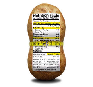 ポテトは栄養が豊富な食材の一つ。皮付きの中サイズ1個(約150g)の大きさで、一日の摂取量の約半分(45%)のビタミンCや、バナナ1本分よりも多いカリウム(620mg)を摂取することができる。しかも脂肪、ナトリウム、コレステロールは含んでおらず、カロリーも110キロカロリーと低めとなっている。