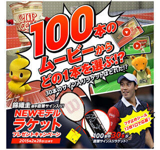 使用しているラケットがサイン入りのものかどうかは、動画をよく見ないと分からない仕掛けになっているという。応募には対象商品のフタ止めシールが12枚必要。ハガキにフタ止めシールを貼り、欲しいラケットの番号を書いて応募すると、抽選で100名にラケットをプレゼントする。