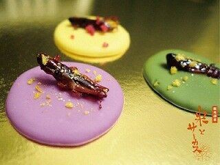 昆虫チョコの黄色は、かぼちゃチョコ×フリーズドライいちご×イナゴの佃煮、紫は紫芋×フリーズドライマンゴー×イナゴの佃煮、緑は抹茶×フリーズドライいちご×イナゴの佃煮という組み合わせとなっている。