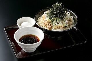同店では、北海道産小麦を100%使用した自家製の平打ちの太麺を、つけ麺スタイルで提供。熱々の茹でたてをザルにあげ、冷水で一気に締めた麺はもっちりと噛み心地がよく、小麦の味わいを楽しめるという。商品は、冷たいつけ汁のうどんを3種類、温かいつけ汁のうどんを1種類を用意(麺は共通)した。