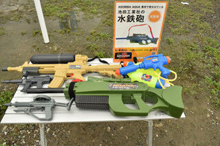 レンタル用に貸し出されていた3種類の水鉄砲は、すべておもちゃや雑貨などの製造・販売を行う池田工業社の製品。どれも本格的で迷ってしまうが、ライフルのような形状をしている「水ピストル エアマシンガン 003」を選択した。あらかじめ前方の圧縮レバーを何度かスライドさせておくことで圧力を蓄え、片手で撃てる点が特徴。これなら、やろうと思えば2丁拳銃も可能だろう。