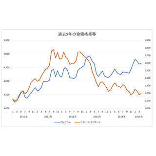 一方、日本での金価格の推移をみると、ギャップはありますが、世界市場の金価格同様に右肩上がりで上昇し、2013年初めに1gあたり5000円近くまで上昇。その後いったんは下落するものの、2014年後半から、一転して上昇基調になり、2015年5月平均で1g=4600円台に戻しています。6月19日現在の小売価格では、1g=5169円。5000円台を超えてきました。