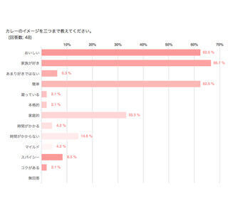 まず、カレーのイメージを尋ねたところ、最も多かったのが「家族が好き」(66.7%)だった。次いで、「おいしい」「簡単」(同率62.5%)、「家庭的」(33.3%)と続いた。これらのフレーズから、カレーに対し「家族が喜ぶおいしいものを、簡単に作ることができる」と思っている人が多いことがうかがえる。