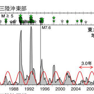 この結果、三陸沖の東部では、スロースリップの速度に約3年周期の変動が見られることがわかった。さらに、同地域のマグニチュード5以上の比較的大きな地震について調べると、これらの地震の数も約3年の周期的増減をもつととともに、スロースリップが発生している時期には約6倍もの地震が発生していることが明らかになった。同様な大規模地震とスロースリップの関係は、三陸沖西部を含め、解析された10地域中8地域で見られ、東北地方太平洋沖地震の発生時も、北部の領域でスロースリップの速度が増加している時期に対応していたという。