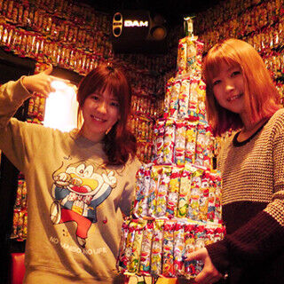 このバーの壁面には約2万本のうまい棒が敷き詰められており、うまい棒に囲まれてお酒を楽しめるようになっている。もともと、インパクトあるバーを始めたかったという、うまい棒好きの社長・大山圭太さんが、突然のひらめきで2015年5月にオープンさせた。店内の壁一面が、さまざまなフレーバーのうまい棒でぎっしりと埋め尽くされていて、客は壁から好きなうまい棒を自由にちぎってサクサクサクサク、というシステムになっている。