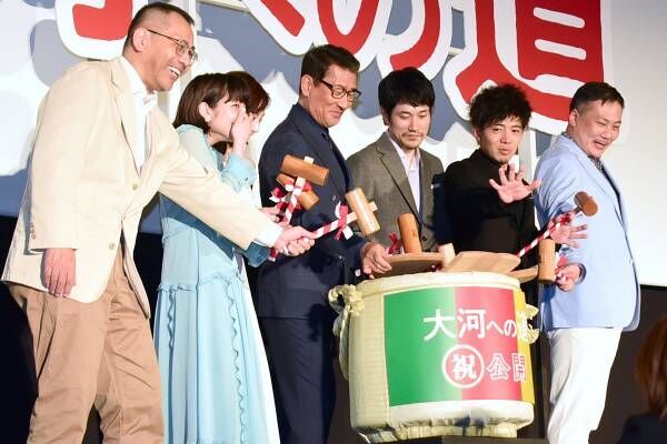 映画『大河への道』(5月20日公開)の公開初日舞台挨拶が20日に都内で行われ、中井貴一、松山ケンイチ、北川景子、岸井ゆきの、和田正人、田中美央、中西健二監督が登場した。