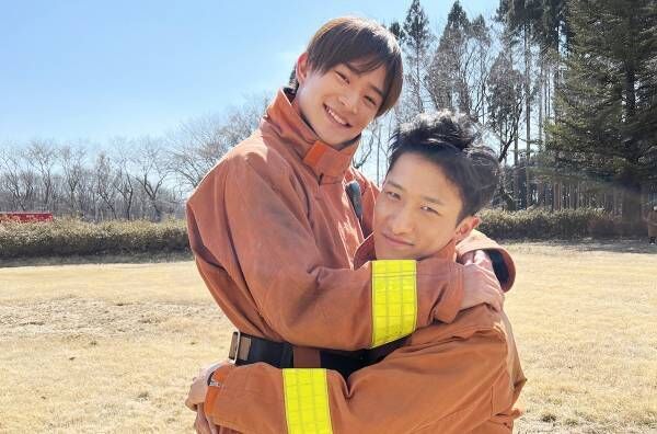 この度解禁されたのは、主演の蛯原を演じた岩本照と、蛯原の後輩・児嶋を演じた浮所飛貴が原作1巻のビジュアルの再現に挑戦したオフショット。「ヒロインになりたい!」という浮所たっての希望から、岩本とヒロインの萌衣役・生見愛瑠も真似た原作1巻のポーズを再現したという。浮所は右足の角度まで寄せており、再現度、完成度ともに抜群のオフショットとなっている。