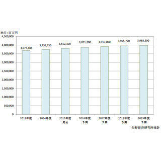 矢野経済研究所では、これらのことから自治体向けBPO市場は2013年度から2019年度までの年平均成長率(CAGR)1.4%で推移し、2019年度の同市場規模は3兆9883億円になると予測している。