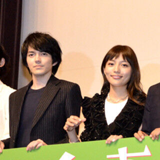 俳優・林遣都と川口春奈が1日、都内で行われた映画『にがくてあまい』(9月10日公開)完成披露試写会舞台挨拶に、共演の淵上泰史、SU、中野英雄、石野真子、草野翔吾監督とともに出席した。