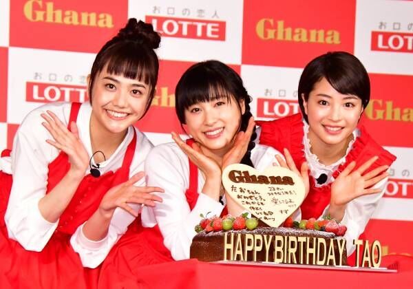 2月3日に23歳の誕生日を迎える土屋太鳳。誕生日を翌々日に控えたこの日は、ロッテ「ガーナチョコレート」のCMで共演している松井愛莉と広瀬すずから手作りのバースデーケーキを贈呈された。思わぬサプライズに頬を緩ませた土屋は、2人からケーキを食べさせてもらって「生きてて良かった! 美味しい!」と舌鼓を打ちながら「初めてたくさんの方々に誕生日を祝ってもらったのが最初のガーナのイベントで、すごく印象に残っています。あれから3年ぐらい経ちましたが、すずちゃんや愛莉ちゃんとご一緒できて本当に幸せでした」と2人に感謝の言葉。23歳の抱負として「色んな音楽を聴いたり本を読んだりして、知識の幅を広げていけるような年になったらと思います」と意気込んだ。そんな土屋に対して松井が「素敵な誕生日にしてね!」と祝福。広瀬も「初めて会ったのが18歳で高校生でした。