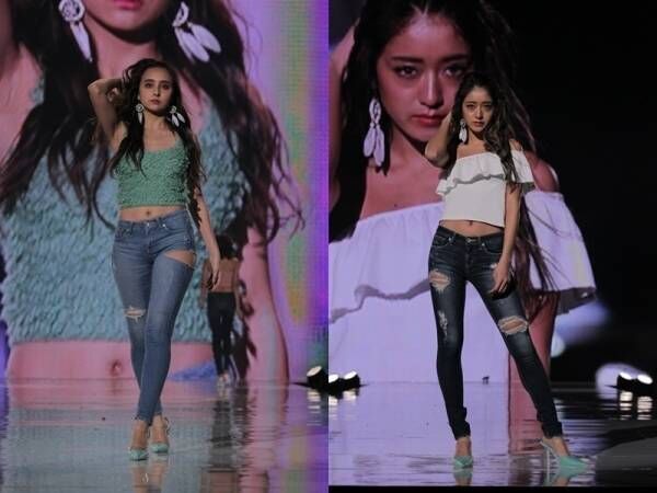石田と池田は「GYDA」のステージで、デニムにショート丈のキャミソール、オフショルダーのトップスというコーデを披露。引き締まったウエストや美しいデコルテで観客の視線を釘付けにした。