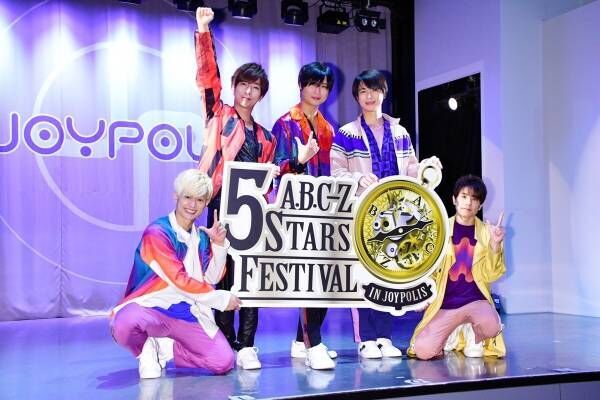 アイドルグループ・A.B.C-Zの橋本良亮、戸塚祥太、河合郁人、五関晃一、塚田僚一が16日、東京・台場の東京ジョイポリスで行われた「A.B.C-Z 5STARS FESTIVAL IN JOYPOLIS」の記者会見に出席した。