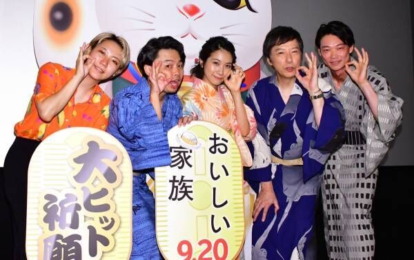 舞台あいさつの最後にはふくだ監督の母によるふくだ監督への手紙を松本が代読するというサプライズも。それに思わず涙を流したふくだ監督は「誕生日会か」と照れながらも「私は両親と血の繋がりがない養子なんですが、産んでくれた人も含めて色んな人に優しくしていただいて生きてきました。ですからこういう映画を撮って色んな人に返していかなければという気持ちが強く、見てくださった皆さまにちょっとでも感じてもらえたらうれしいです」と感激しきりだった。映画『おいしい家族』は、9月20日より全国公開。