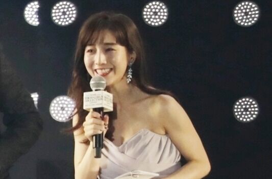 3回連続の起用となり、安定感のあるMCでイベントを進行した田中。前半はデコルテや背中があらわなベアトップドレスに身を包み、胸の谷間もチラリ。後半は黒のドレスに着替え、髪型もチェンジして印象を変えていた。