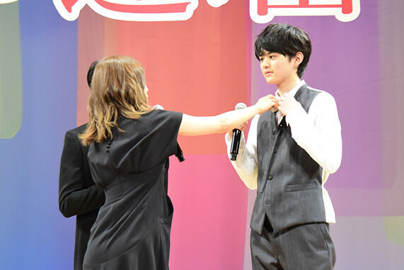 「言葉では言い表せないほど素晴らしい小説の実写映画化ということで、挑戦というより戦いの日々でした」と振り返る松岡。また女優・広瀬すずにスカウトされたという新人・鈴鹿は「こんなにフラッシュを焚かれるのは人生初なので、眩しいです」と初々しく話すが、松岡は「今回お芝居も初めて、映画初出演ということで、完成披露試写会も初めてなんですよ。どうですか?」と司会のように話しかける。「ホールでよかったなと思います。(今作の)撮影でホールに立ち慣れてるので」と答えた鈴鹿だが、松岡はそんな鈴鹿の蝶ネクタイを直し、森崎もチェックするなど、全員が鈴鹿を見守る体制となっていた。