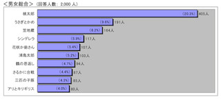 バンダイは、0歳~12歳の子どもを持つ保護者2,000人 (男の子の保護者1,000人、女の子の保護者1,000人)を対象に、「お子様に語り継ぎたい童話や昔話は何ですか?」というテーマでアンケート調査を実施した。今回の調査では、「桃太郎」が全体の20.3%(405人)を占め、総合1位となった。