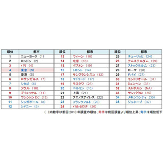 以下、3位「パリ」(前回4位)、4位「東京」(同3位)、5位「香港」(同5位)、6位「ロサンゼルス」(同7位)、7位「シカゴ」(同6位)、8位「ソウル」(同10位)、9位「ブリュッセル」(同11位)、10位「ワシントンDC」(同13位)と続いた。
