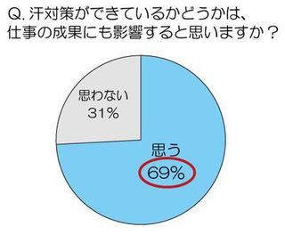 また、「汗対策ができているかどうかは、仕事の成果にも影響すると思いますか?」と質問をすると、約7割が「思う」と回答。