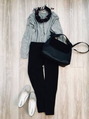 ワントーンブラックスタイルに、グレーのカーディガンは大人の雰囲気を損なうことがありません。