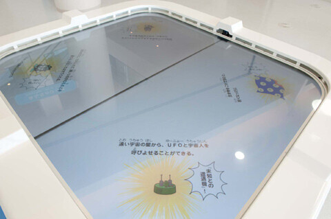 2階のメインスペース、みんなの広場には、「SF-すこしふしぎ-」を実際に体験できるアイテムが揃っている。広場の中央に置かれた『ひみつ道具アーカイブス』は、パネルをタッチすると「ひみつ道具」がランダムで飛び出してくる、未来っぽいスペース。